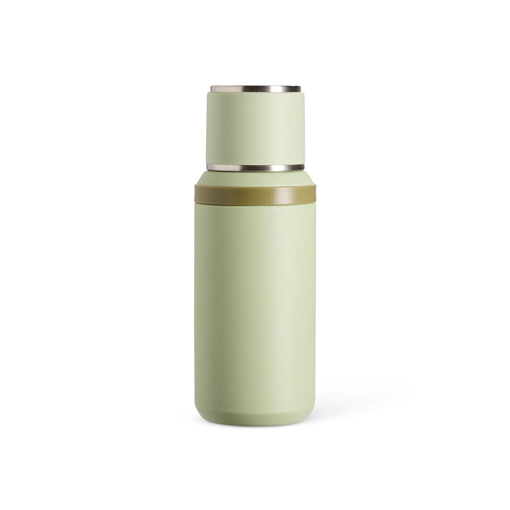 Garrafa térmica em inox com pintura eletrostática e capacidade de até 600ml. Possui estrutura de parede dupla e tampa interna rosqueável com anel de vedação, abertura do bocal por botão de acionamento e infusor. Conta ainda com tampa externa em formato de caneca e alça emborrachada para transporte.