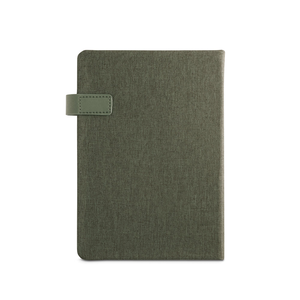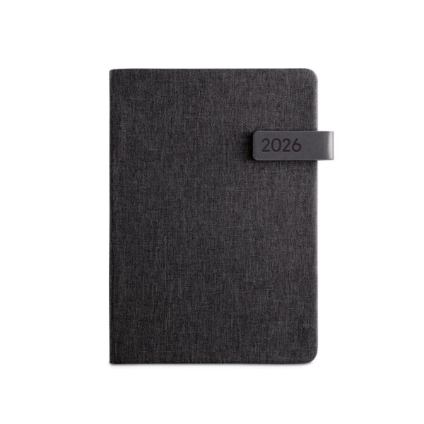 Agenda A5 em PET reciclado (100% rPET), com fecho magnético em PU. Possui um marcador em fita e suporte para esferográfica (não inclusa). Está organizada num plano diário. Fornecida com bolsa de non-woven.