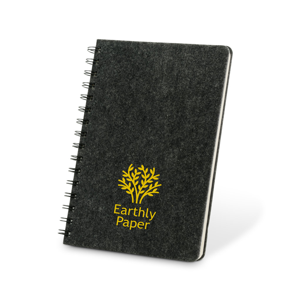 Caderno A5 de capa semi-rígida em feltro 100% reciclado, com argolas. Contém 160 páginas pautadas (70 g/m²) em papel cor de marfim 100% reciclado.