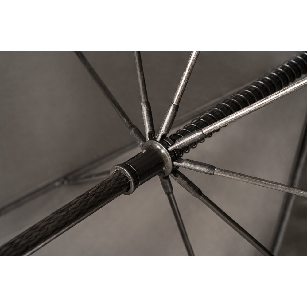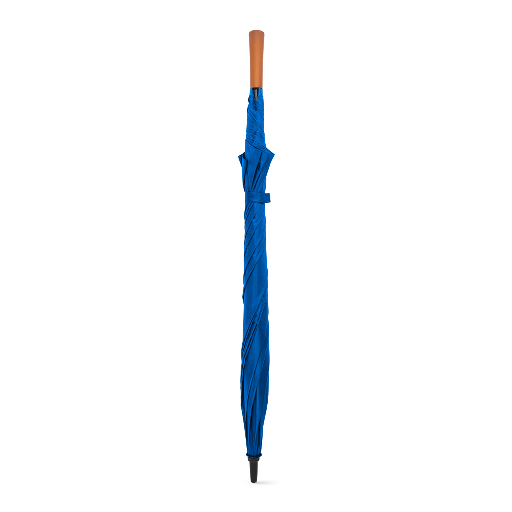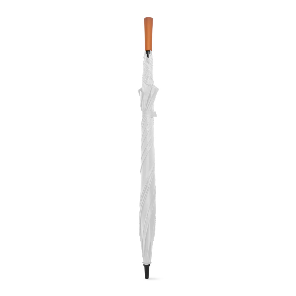 Guarda-chuva de grande portaria em poliéster pongee 190T, com varetas e haste em fibra de vidro e pega em madeira.